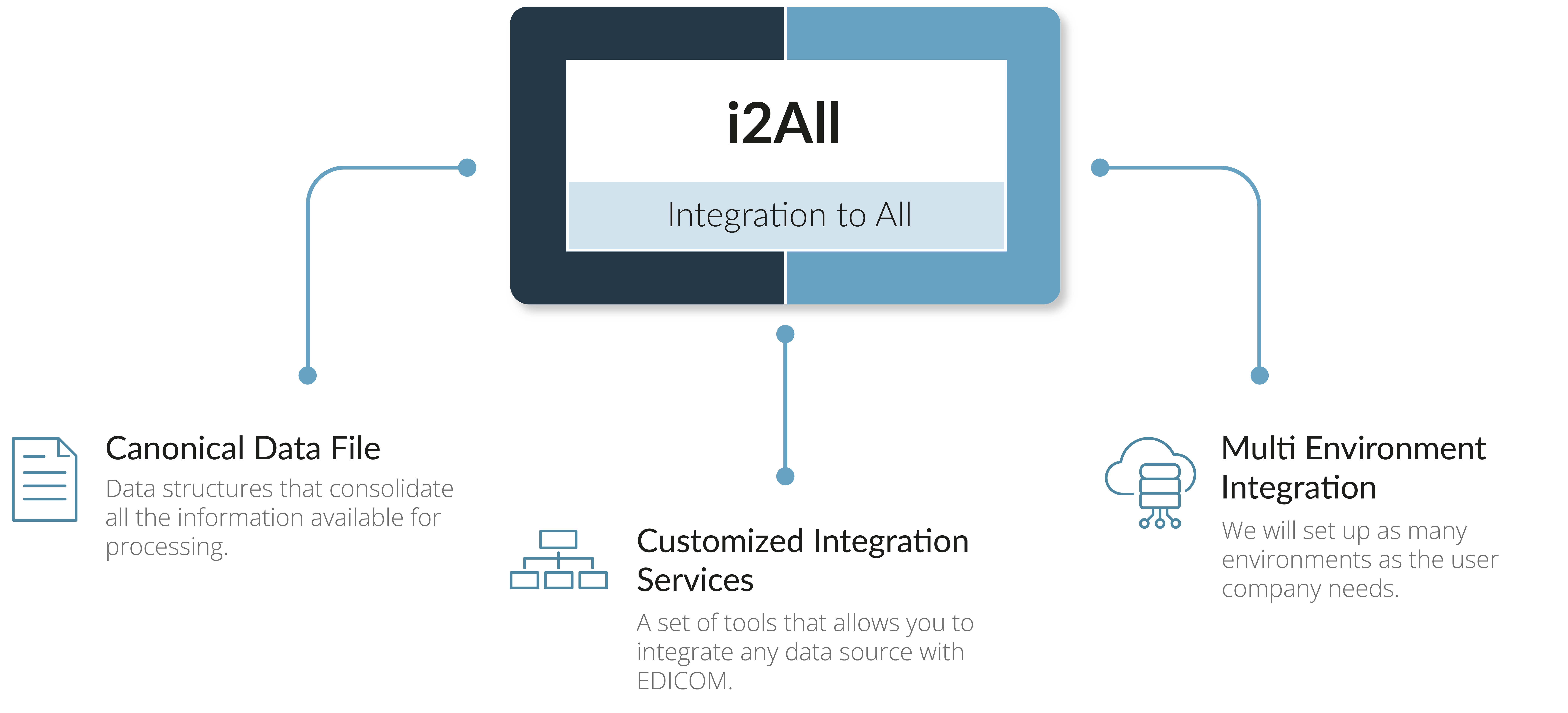 A Plataforma EDICOM permite a integração de todo o seu ecossistema de aplicativos, com base em interfaces " canónicas ". Estas são estruturas de dados globais que consolidam todas as informações suscetíveis de serem processadas por nossa plataforma.